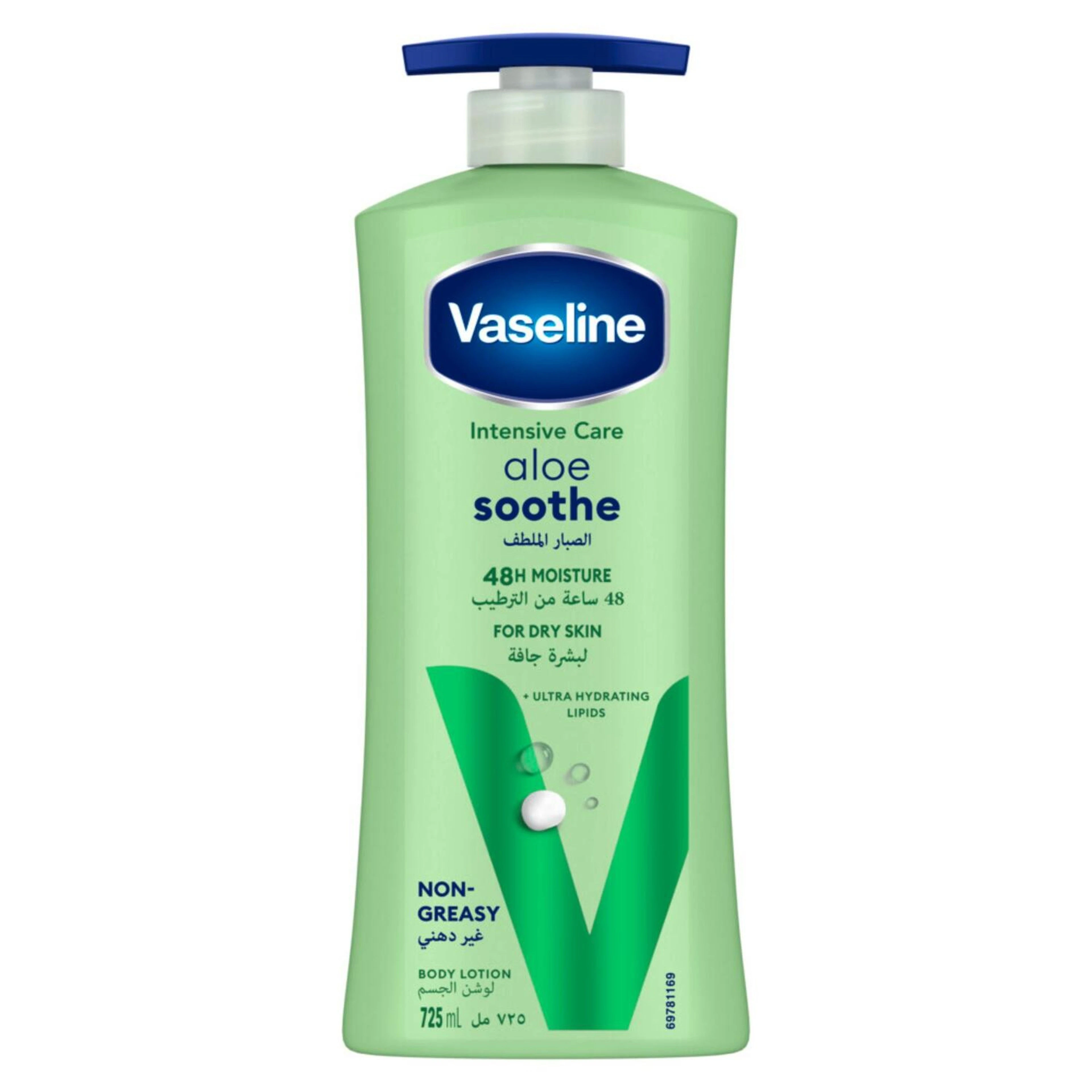Vaseline Intensive Care Aloe Soothe Body Lotion for Dry Skin is specially formulated to help calm and moisturise dry skin. With microdroplets of Vaseline Jelly to lock in moisture, this daily body lotion helps your skin to stay moisturised, so that it feels soft and smooth for up to 48 hours. From the first application, Vaseline Intensive Care Body Lotion calms the discomfort associated with dry skin and leaves your skin feeling deeply moisturised and rejuvenated. The light and non-greasy formula is quickly absorbed to help replenish your skin's moisture from deep* within. The gentle natural power of aloe vera helps to calm skin that has been exposed to sun and dry air, while Vaseline Jelly helps to capture moisture in the skin and prevent it from quickly drying out again. This refreshing and moisturising body lotion for dry skin can be used daily on hands and body to help rejuvenate dry and irritated skin and protect it against the damaging effects of dry, hot weather. Apply daily to restore moisture and relieve dryness without any greasiness. Vaseline's expertise in skin care has stood the test of time, and our Vaseline Jelly has been trusted for skin protection for over 150 years. Trust Vaseline to soothe and protect your skin. *Within the stratum corneum.